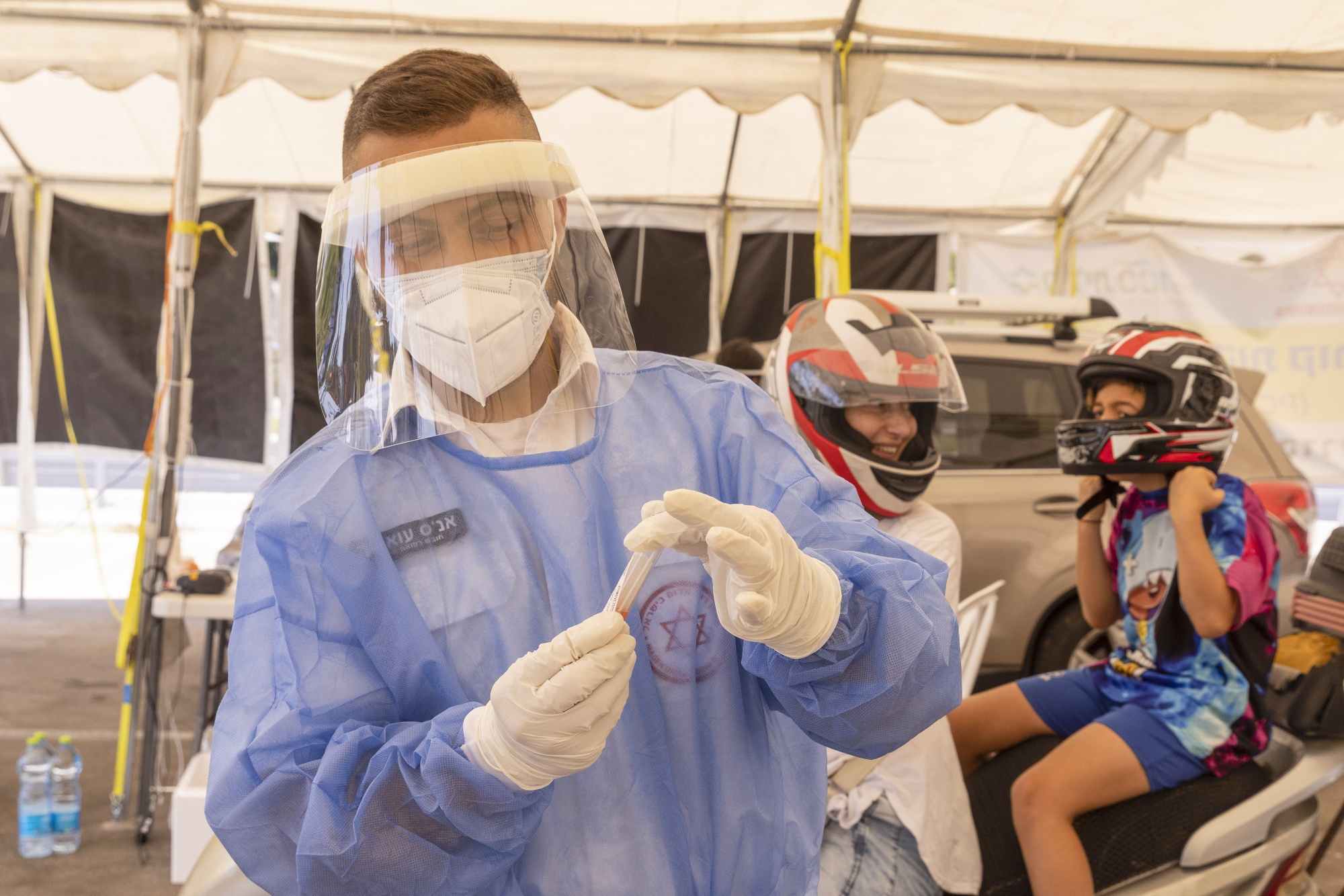 A health worker prepares a swab sample for Covid-19 rapid antigen tests at a drive-thru testing facility in Tel Aviv.