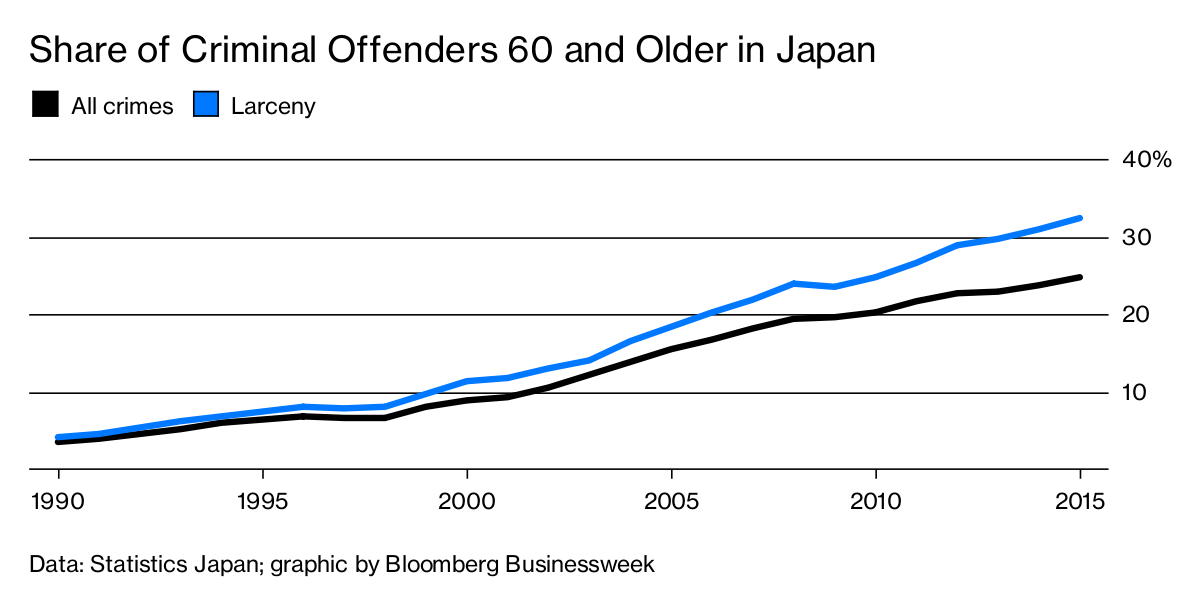 Every aging society faces distinct challenges. But Japan, with the world’s oldest population (27.3 percent of its citizens are 65 or older, almost twice the share in the U.S.), has been dealing with one it didn’t foresee: senior crime. Complaints and arrests involving elderly people, and women in particular, are taking place at rates above those of any other demographic group. Almost 1 in 5 women in Japanese prisons is a senior. Their crimes are usually minor—9 in 10 senior women who’ve been convicted were found guilty of shoplifting.