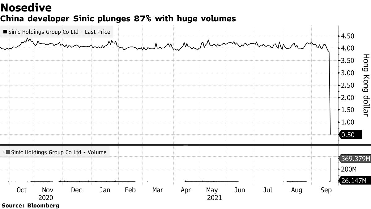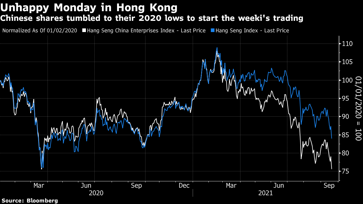 The Evergrande MomentAs the week starts, Hong Kong is gripped by the fast-developing crisis at real estate developer China Evergrande Group, which is on the brink of skipping payments due to banks. With mainland Chinese markets closed for a holiday, this has translated into a nasty selloff in Hong Kong, which has seen the Hang Seng Chinese Enterprises Index (often referred to as H-shares) touch its low from the pandemic shutdown last year:
