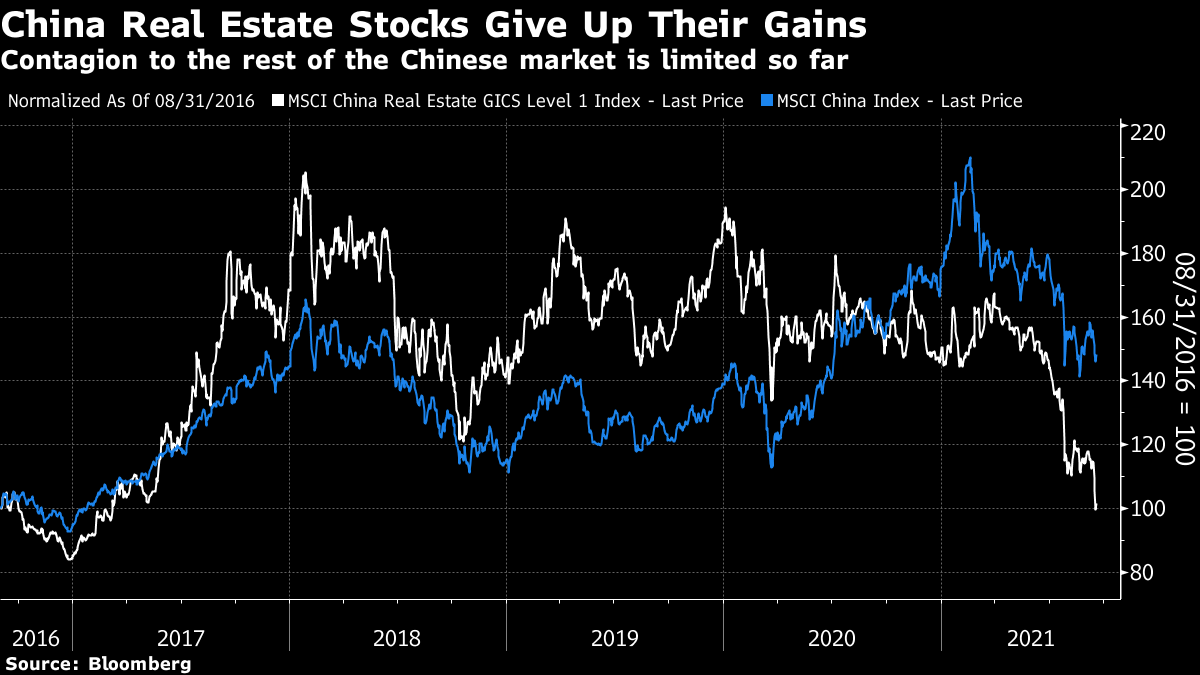 Something similar is afoot in the Chinese stock market, which topped earlier this year after what had appeared to be an unsustainable rally. Its initial dive predated the problems for property stocks, and it has largely stayed stable over the last month as real estate has taken a further leg down. With plentiful stock-specific reasons for problems elsewhere in the index this year, as the government clamped down on various large technology companies, it's fair to say that the Evergrande situation has caused no significant contagion so far: