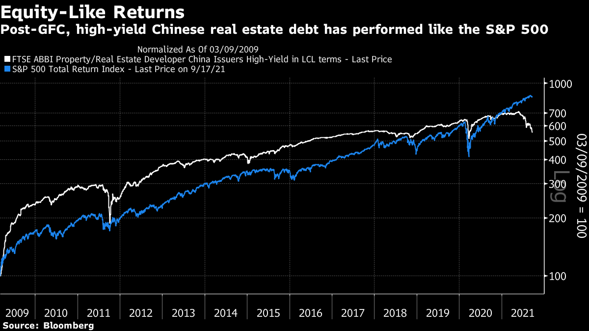 If the yield has topped 60%, the market takes it as a given that not all of the coupon is going to be paid. Meanwhile, if we look at the performance of high-yield Chinese real estate debt (as measured by the FTSE ABBI Asian debt index), and compare it to the total return on the S&P 500 since the post-GFC bottom in March 2009, we discover that until the last few weeks, lending to low-quality Chinese property developers had made more money than investing in a stock market populated with all the monopolistic monsters that were busily making profits from the rest of the world. That is plainly madness. There have been worries about a potential Minsky Moment in the Chinese property market for the best part of a decade now. This chart amply justifies those worries: