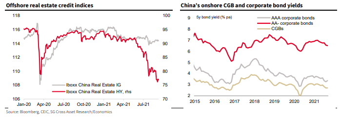 To gauge the precise effects on the biggest names in the Chinese high-yield index, it is worth looking at this Twitter thread from Jens Nordvig of Exante Data Inc. There is evident contagion in the real estate sector; yields of companies in other industries, including even banks, haven’t moved much, at least yet. And, as this chart produced by Societe Generale SA shows, there has been no contagion from high-yield to investment-grade debt: