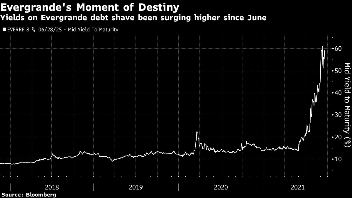 As with Lehman and LTCM, this problem has advertised its presence. This is how the yield on Evergrande debt due in four years has moved since it was issued: