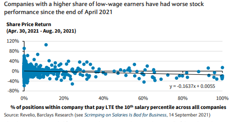 The following chart from Barclays Plc shows the relationship between the proportion of a company’s workforce whose pay is in the lowest decile (on the horizontal axis) and its share price since the nadir last spring. It shows a slight but statistically significant relationship; companies with more lower-paid workers tend to have had poorer stock market performance: