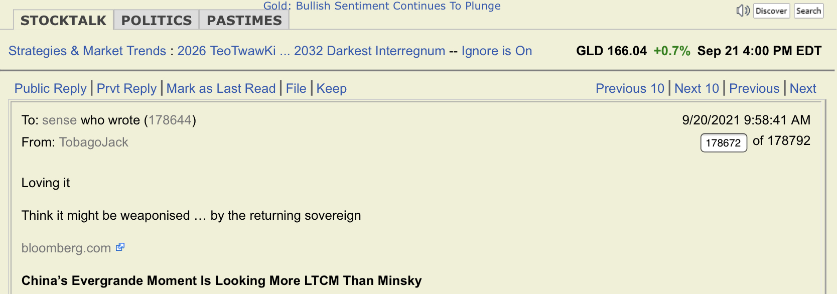 The welter of research into Evergrande in the last few weeks comes to a clear consensus. Yes, Evergrande is big enough to create a Minsky Moment within the Chinese market. But we should expect the response to be far more LTCM than Lehman. For the short term, therefore, this implies a nasty and messy market, but not an all-out implosion. It also implies a distinct risk that the Chinese authorities make the same mistake as the Fed under Alan Greenspan 23 years ago, and unwittingly create the conditions for one last disastrous bout of speculation, despite having precipitated the pressure on Evergrande.
