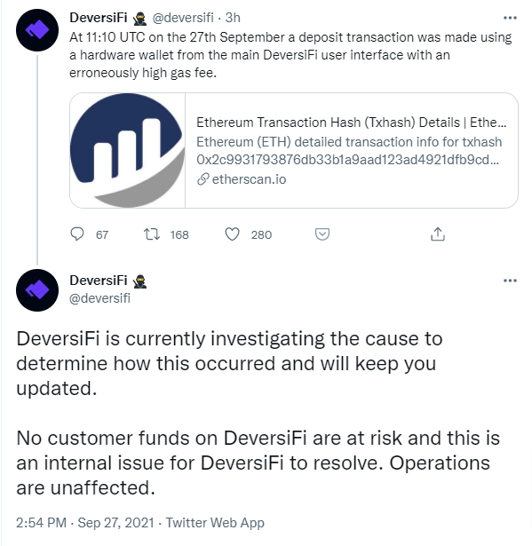 “No customer funds on DeversiFi are at risk and this is an internal issue for DeversiFi to resolve,” it said in a tweet. “Operations are unaffected.”