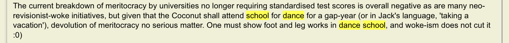 (1) During audition she got accosted by freshman co-ed who was also auditioning, and who upon finding the Coconut is the girl from HK introduced herself, “I am good friend of XXXXXX whose dad is a partner of your dad in business”