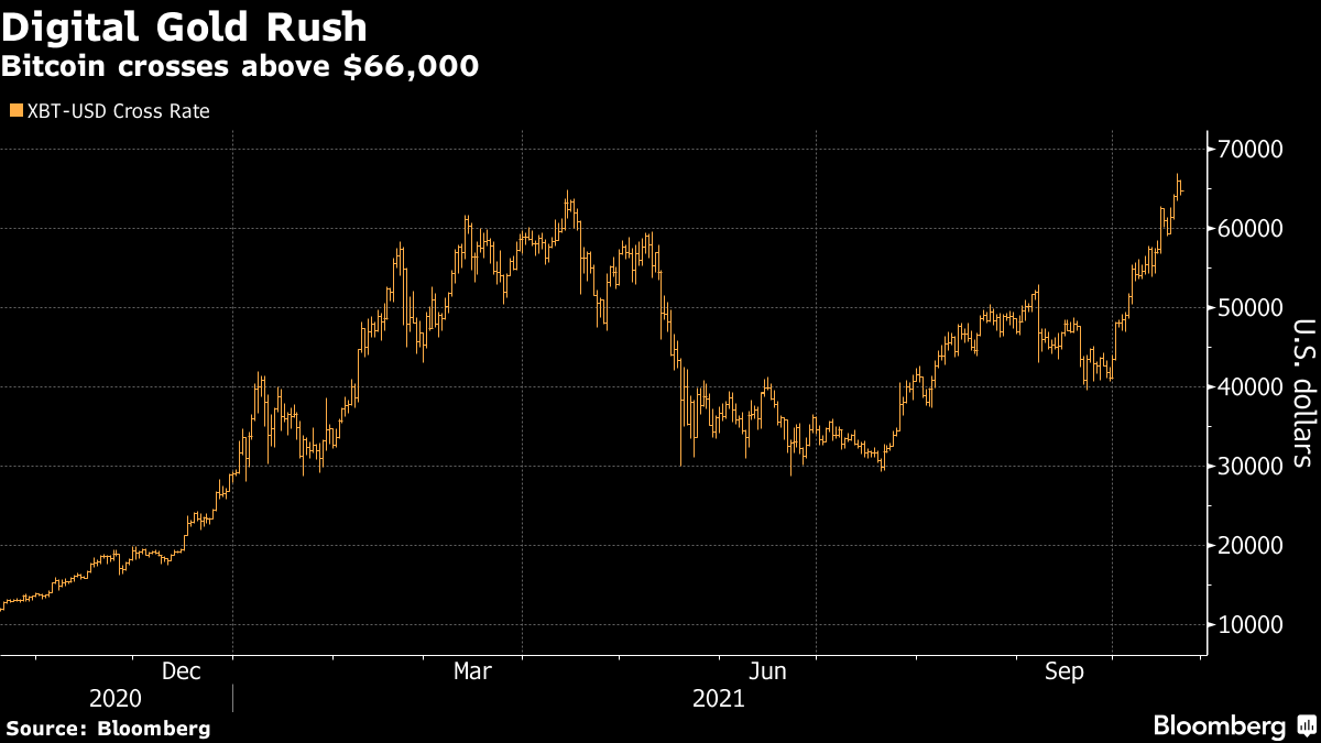 Bitcoin was holding at about $64,650 as of 11:30 a.m. in Hong Kong trading Thursday after rocketing to a fresh record overnight. The largest digital currency touched a high of almost $67,000 Wednesday, galvanized by the successful launch of the first U.S. Bitcoin futures exchange-traded fund -- the second-busiest ETF debut on record and another step in its evolution from the frontiers of finance toward something with more mainstream appeal. The cryptocurrency has rallied some 120% in 2021 -- and for some believers, $100,000 is once again in sight.