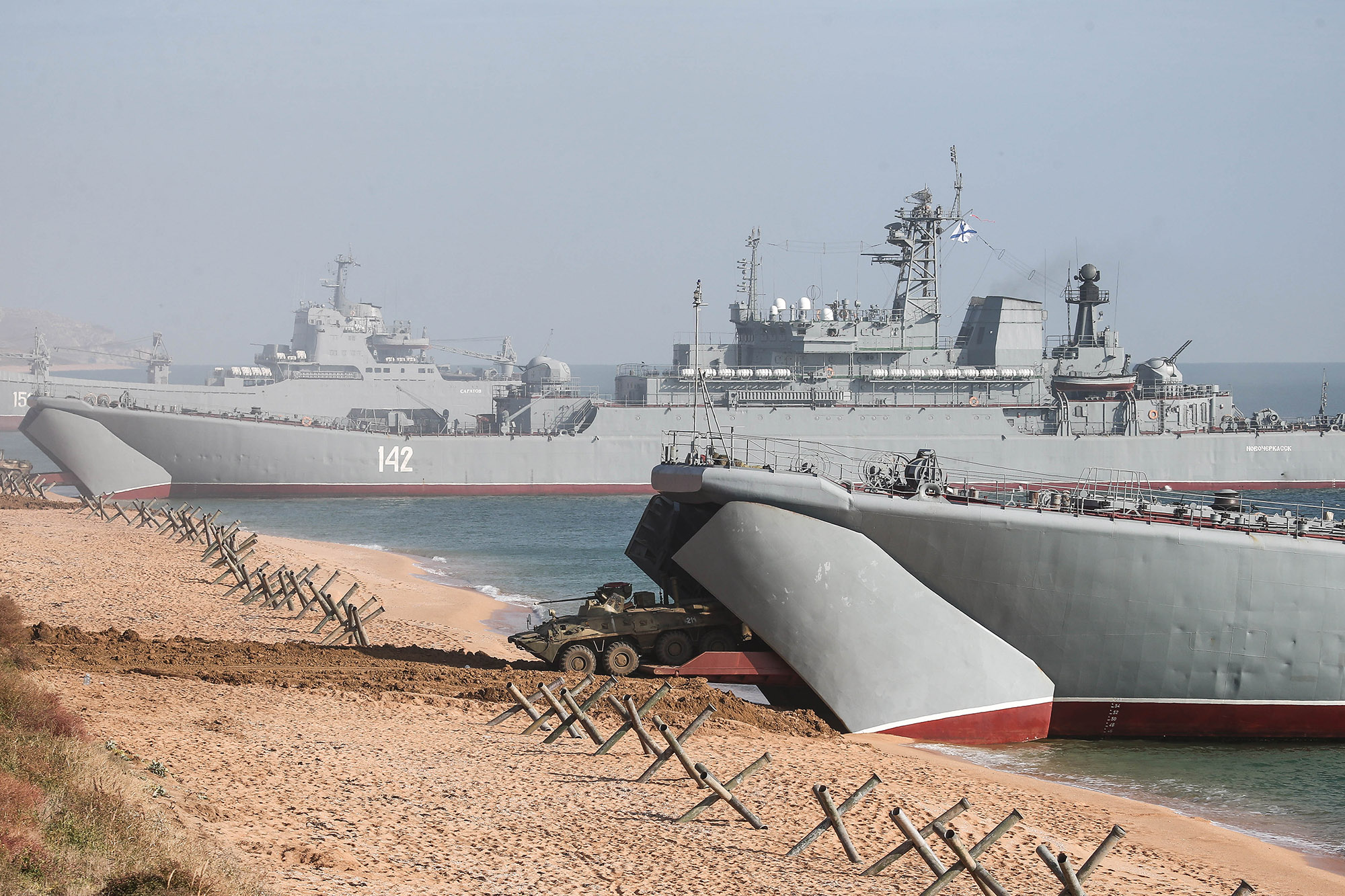 A BTR-82A armored personnel carrier lands from a ship during an amphibious landing exercise in Crimea on Oct. 18.