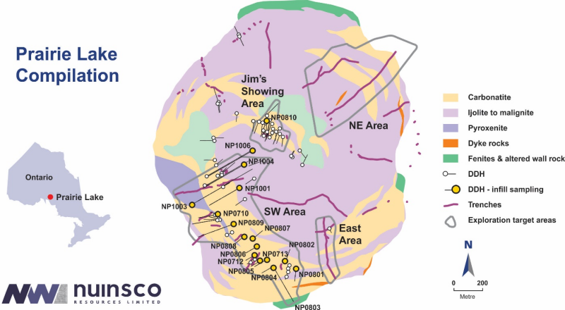 “Drill hole NP0810 was drilled to test Jim’s Showing, near the centre of the Prairie Lake complex (see map below), and is approximately 500m north of the centre of the SW Area where most of the sampling has been conducted this year,” said Paul Jones, Nuinsco’s CEO. “The analytical results from NP0810 reinforces our understanding of the extensive endowment of Critical Elements and phosphate mineralization in the Prairie Lake complex rocks and the implications for economic potential. Prairie Lake is a vast repository of these Critical Elements of economic interest with superb logistical attributes. As conversion of the world’s economies to increased electrification accelerates demand and prices for these Critical Elements are forecast to increase substantially; a process that has seen the price of neodymium (neodymium oxide 99.0% purity) alone increase from circa US$60/kg to circa $140/kg between August 2020 and the present (source: kitco.com).”