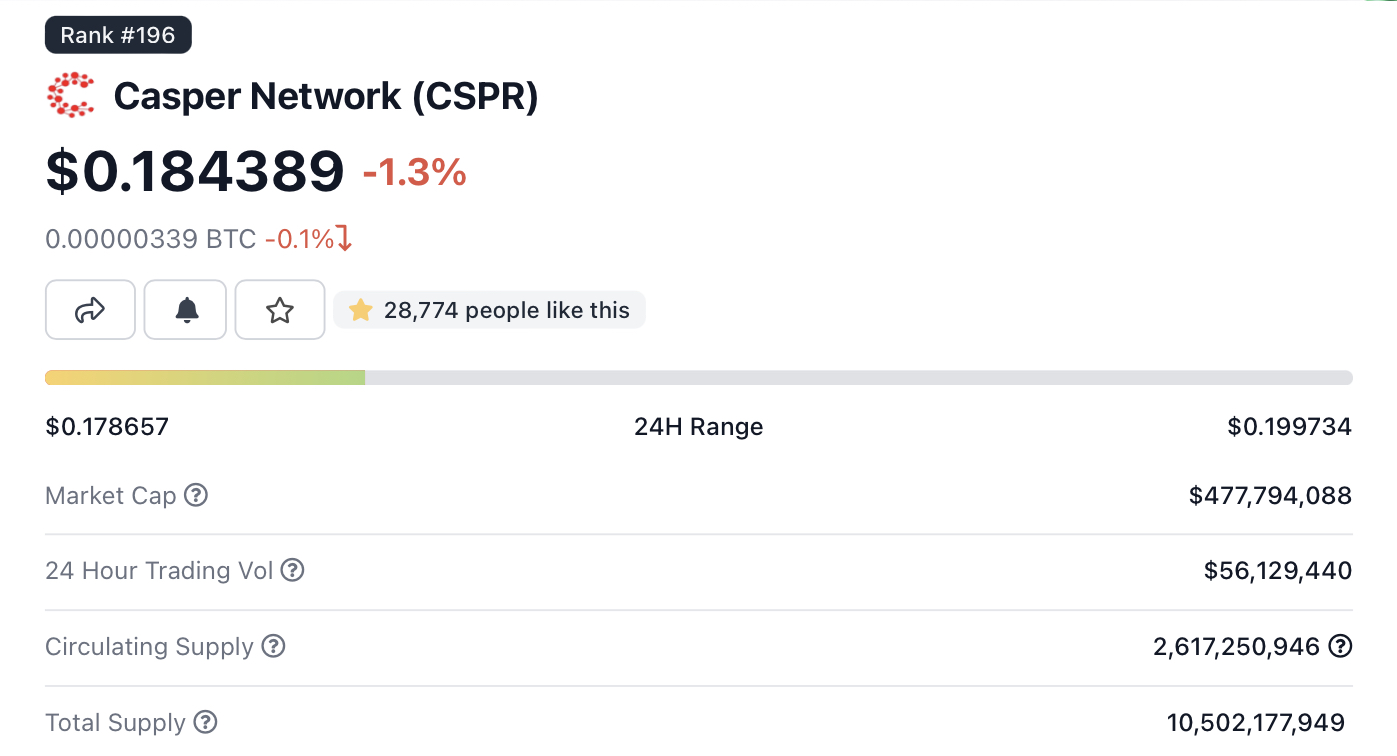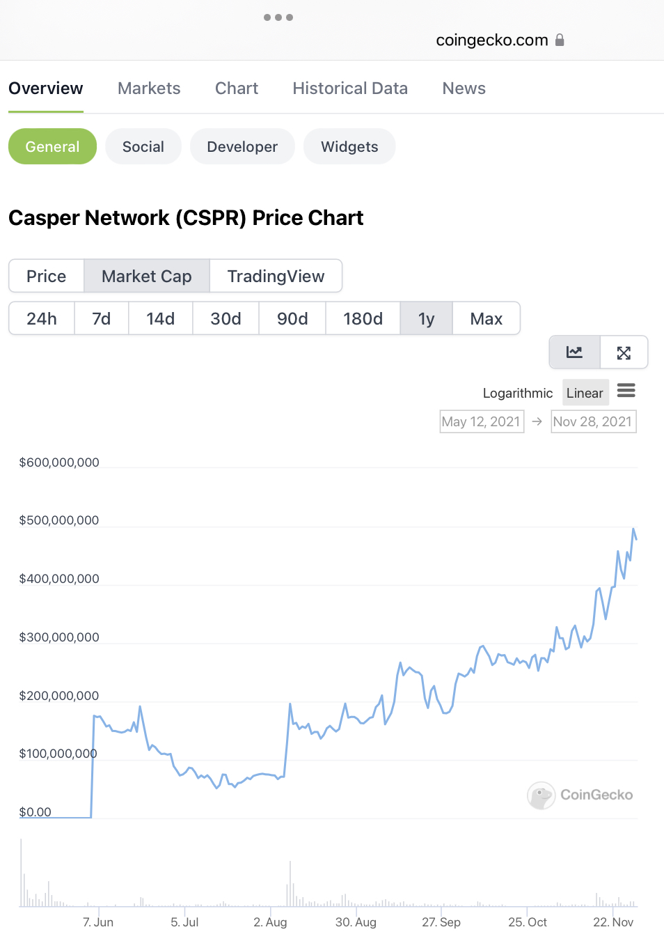 Read Replies (1) | Respond to of 217573 Re <<Didn't you just buy a crypto that pays dividends? "How hard can it be to fake dividends? " Obviously not hard! Could you please explain how that is supposed to work? Issue more digital crypto? >>Message 33590561 PM, do yourself a favor, give Message 33593850 a read. I deliberately posted this message to myself so that it is on-chain, block-chain like, for easy reference as we progress on nation-building Message 33593875 but shouted out to you on a side chain :0) The ‘interest’ / ‘dividend’ / ‘inflation’ / yield ranges between 8 - 24%, depending on the number of coins delegated to validators to stake nodes that verifies network activity If all coins are staked, the yield drops to 8% ‘inflation” paid to stakers / HODLrs. The validators take a fee (1-10% of the yield) per staking-agreement. The decentralized development group pays part of its yield (it holds a chunk of the coins since TGE (The Genesis Event) to developers who had submitted and obtained grants to work on whatever projects. The validators use their fees on yields to underwrite the node computers etc etc that works to verify network transactions and maintain network security. All happens as part and parcel of the protocol, and automatic. No one is in charge. Soon (this side of 2021) a third-party shall launch a decentralized investment bank (CasperPad) that shall serve as a market / launch pad / crowd-funding platform for future projects its stakeholders deem worthy. The token,coincidentally, is termed CSPD, and the way to get some at the get-go is to buy / stake 3,000 - 150,000 CSPRs, be allocated CSPDs, pay for CSPDs, buy more, ride another wave up, so as to benefit from the rise of CSPR, CSPD, and whatever projects CasperPad underwrites as an investment bank. Allocation to ICOs of future projects depends in part on staked CSPDs. It is all wonderful. I bought my CSPRs initially by private sales, starting in Q1 2020 ($0.01), topped up Q1 2021 ($0.015), and added subsequently at 0.06 - 0.125, and a couple of weeks ago at $ 0.1345. My average cost is ~ $ 0.03 Now the CSPR price is at Now the CSPR market cap is at coingecko.com The yield has been ~10% APY, and there is no reason it would drop unless validators w/ staked-coins for voting says to change the monetary policy. An algorithm determines the monthly yield (APY 8 - 24%) depending on folks staking vs trading the CSPRs. Over time, the Casper Nation ecosystem would be built out, and GDP would result, and the Nation’s coins be worth more, and as long as the Nation is growing because of its monetary policy, governance rules, use-case by corporates, institutions, and governments, etc etc, the yield would continue. When things change, the people, for the people by the people, through the validators, would vote to change (burn coins, drop yield range, etc etc).