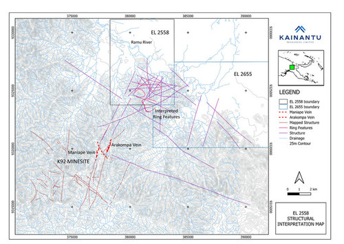 - an interpreted ring feature circa 1.5km in diameter situated on the triple junction of KRL North's EL2558 and El2665 tenements; and K92 Mining's tenement (see figure 1 below inclusive of interpreted ring features at KRL North).