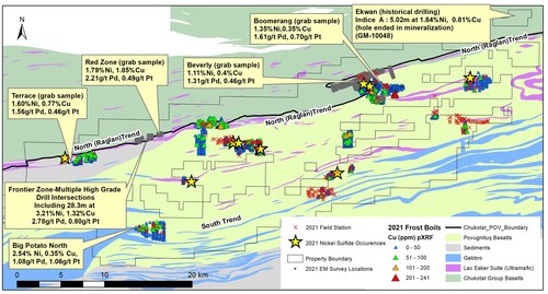 Figure 1: Summary of 2021 West Raglan Work with Historical Results Highlighted (CNW Group/Orford Mining Corporation) In January 2021, Orford Mining Corporation (Orford) (TSX-V: ORM) announced it had reached a definitive agreement with Wyloo Metals Pty Ltd (Wyloo Metals) for a $25.0 million earn-in and joint venture over Orford's 100% owned West Raglan property (the "Property") in Nunavik, Quebec. The West Raglan property is a camp scale, advanced Ni-Cu-Co-PGE exploration property covering an area of 71,301 hectares (731 km2) over the same belt that hosts the Raglan and Canadian Royalties mines to the east. Exploration to date has identified high-grade Ni-Cu-Co-PGE mineralization across more than 35 km strike of the 50 km West Raglan Project. Historically, six significant discoveries have been made on the Property with the best results being from the Frontier Zone. The Frontier Zone contains five high grade mineralized lens clusters over a 2,500 meter strike with grades in the range of 2-3% Nickel, 1% copper and 2+gpt PGE (Table 1) including a drill intersection of 28.3 m grading 3.2% Ni,1.32% Cu, 2.4 g/t and 0.7 g/t Pt at the Seahawk Zone.