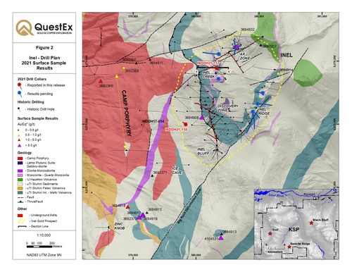 Tony Barresi, QuestEx President comments: "The first two drill holes of the 2021 Inel exploration program both intersected significant mineralization from surface. These holes constituted stepout and infill drilling near the western margin of Inel and were designed to test portions of the broad but lower grade mineralized domain that surrounds some of Inel's higher-grade domains. Nine of the remaining drill holes from the 13-hole program comprised validation and infill drilling of the AK Zone and Inel Ridge, where historical drilling yielded higher grade results. In addition to these encouraging drill results, impressive gold-silver-copper rich prospecting samples with grades up to 23.1 grams per tonne gold, 185 grams per tonne silver and 4.5% copper from Zinc Knob and the Camp Porphyry demonstrate potential to link Inel to other nearby prospects that may contain additional gold or base metal resources."