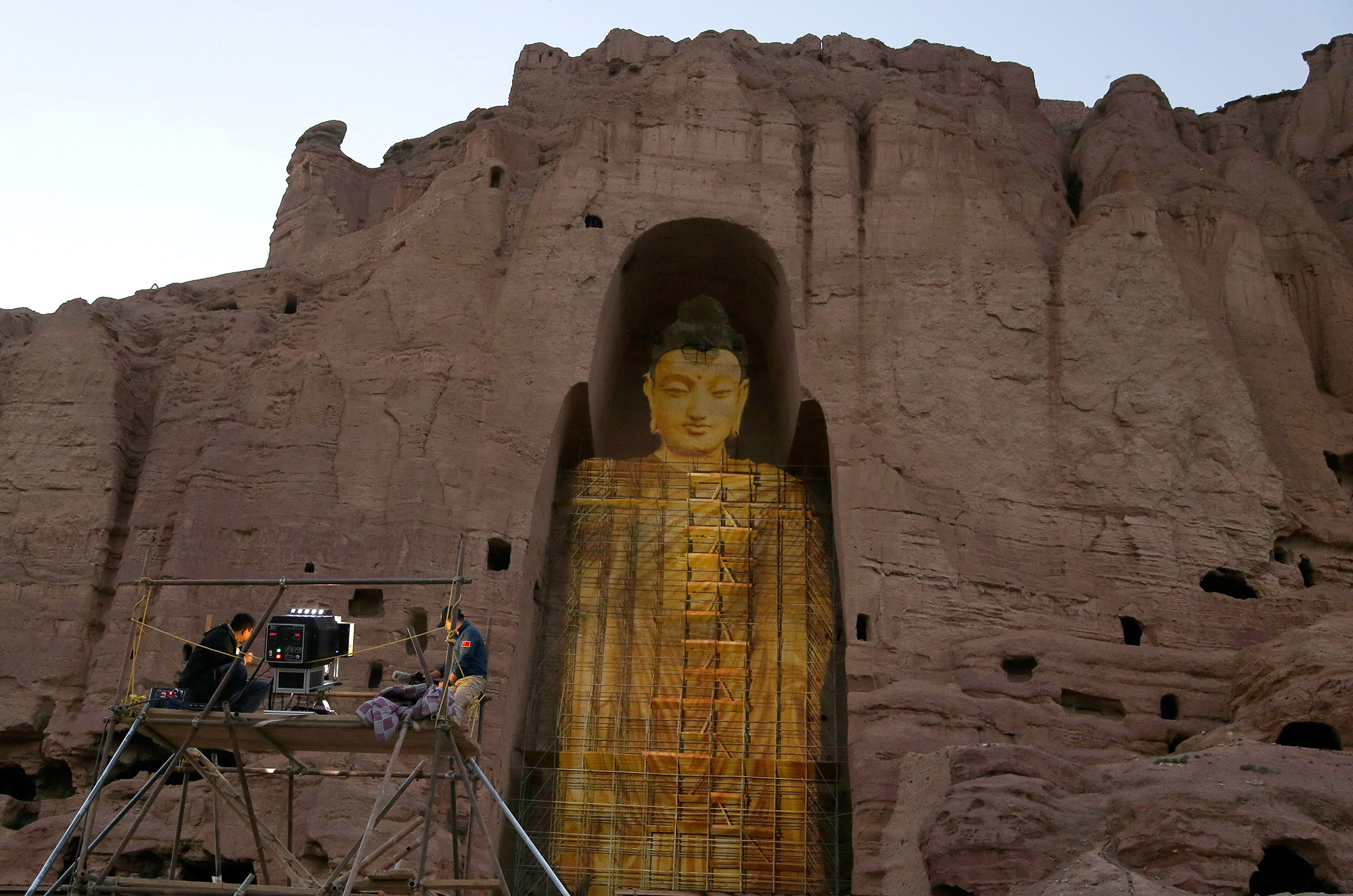 A projected image of a Buddha statue in Bamiyan that had been destroyed by the Taliban in 2001.