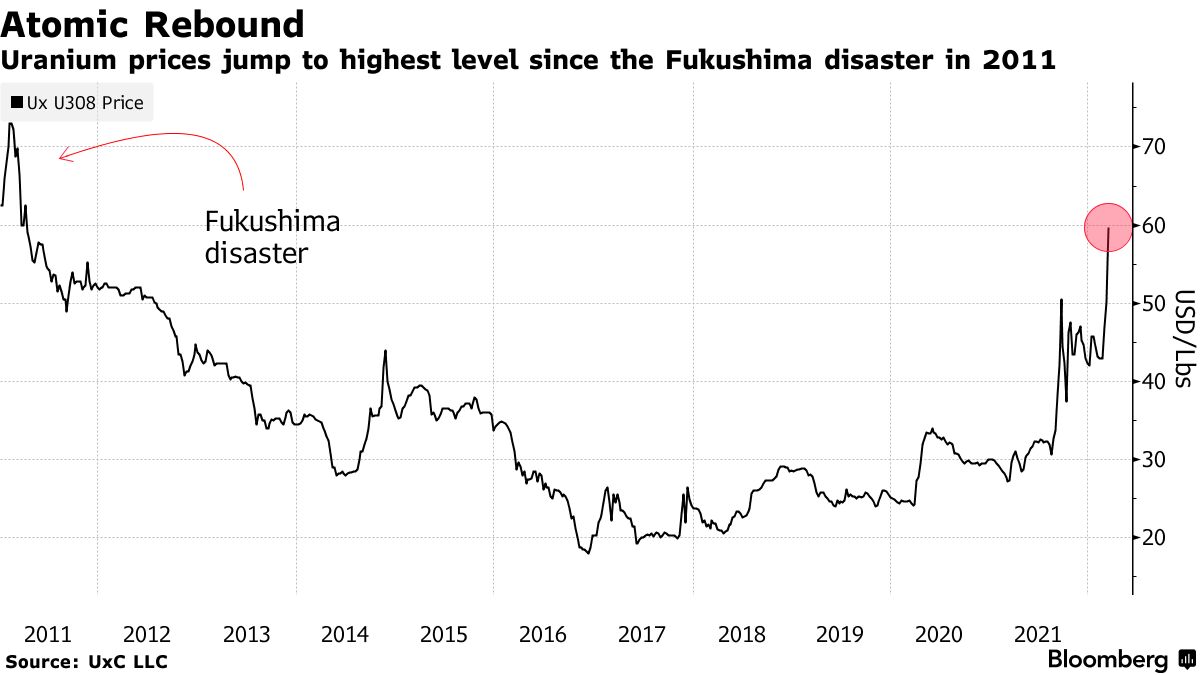 To: bull_dozer who wrote (185134 ) 3/11/2022 4:18:30 AM From: TobagoJack Respond to of 217830 Nuclear bloomberg.com Uranium Surges to Highest Since Fukushima on Russian War Buyers snap up uranium as U.S. weighs sanctions on Rosatom Sprott Physical Trust also actively buying spot supply Stephen Stapczynski 11 March 2022, 12:31 GMT+8 Uranium spot prices soared to the highest level since the 2011 Fukushima nuclear disaster on concern potential sanctions aimed at Russia are poised to roil an already tight market. The price for benchmark Ux U3O8 uranium jumped to $59.75 per pound on Thursday, according to data compiled by UxC LLC. That’s the highest since March 2011, when meltdowns at the Fukushima Dai-Ichi facility shut Japan’s fleet of nuclear plants, sent a shock-wave across the atomic industry and dashed demand for uranium -- the fuel used in reactors. Read more: Russia Uranium Curbs Mulled by Biden Threaten to Roil Market The White House is considering sanctions on Russia’s state-owned atomic energy company, Rosatom Corp. , intensifying concerns over disruptions to uranium exports from Russia. Rosatom is a delicate target because the company and its subsidiaries account for more than 35% of global uranium enrichment. Russia accounted for 16.5% of the uranium imported into the U.S. in 2020. “The fear of Russian nuclear fuel supplies being cut off in the West (especially the U.S. and European Union) has led buyers to enter the spot uranium market over the past two weeks,” said Jonathan Hinze, president of UxC. “As the prospects for future limits on Russian enriched uranium imports in the West remain high, it appears that this upward pressure on spot uranium prices is unlikely to let up.” The Sprott Physical Uranium Trust, a fund which has been aggressively cornering the physical market for the metal, has been actively snatching supply since last month, adding to the bullish sentiment. The fund has boosted its holdings of uranium by more than 10% in the last month. Uranium is the latest raw material to be swept up in the global commodities price rally after Russia’s invasion of Ukraine. International backlash and Russia’s sudden economic isolation is choking off a major global source of energy, metals and crops. To be sure, it’s unlikely that an actual shortage of uranium will develop that forces nuclear power plants to curb output, even if Russian supplies are taken off the table. Cameco Corp., one of the world’s largest suppliers of uranium, could boost output if prices improve enough to warrant additional production over the long-term, according to a spokesperson. There is “significant potential to increase uranium production outside of Russia,” said Jonathan Cobb, a senior communication manager at the World Nuclear Association. “Nuclear plants typically have enough fabricated fuel on site to keep operating for at least a year, and in many cases much longer.”— With assistance by Joe Deaux