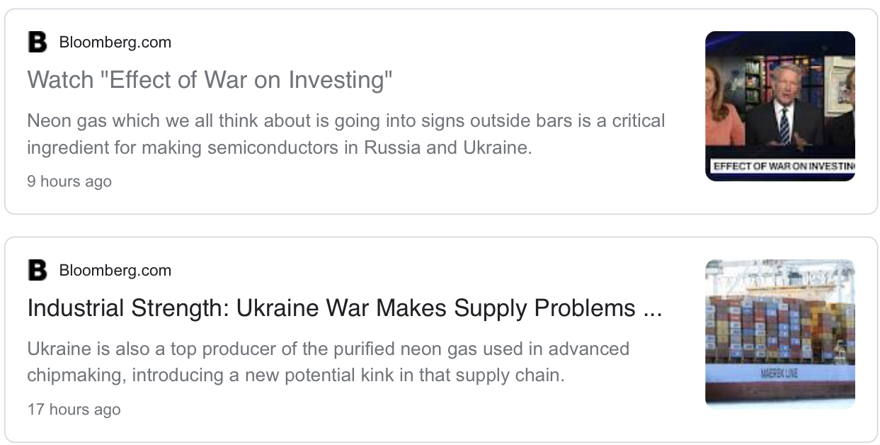 Read Replies (1) | Respond to of 217646 Re <<neon gas >> Rare gases … the f*cking fucks knew what was at stake, and they pulled the trigger, because they can pull the trigger and blamed it on Biden as Biden isn’t actually ‘making’ the decisionsMessage 33705036 March 11thRussia could hit U.S. chip industry, White House warns … Some chipmakers have been reviewing their supply chains to scan for potential fallout from conflict in Ukraine. One person at a chipmaking company who declined to be named acknowledged that it has been looking into its supply of neon and other gases , some of which originate in Ukraine. "Even if there was a conflict in Ukraine it wouldn't cut off supply. It would drive prices up," the person said. "The market would constrict. Those gases would become pretty scarce. But it wouldn’t stop semiconductor manufacturing," he added. According to one power chip design startup executive, unrest in Ukraine has caused rare gas prices to increase and could cause supply issues. Fluorine is another gas that has a large supply from that part of the world and could be affected, the executive added. William Moss, a spokesperson for Intel Corp , said the chipmaker was not anticipating any impact to neon supply. But the issue is still concerning, because global chip supplies are tight and chip orders are only expected to pick up. Techcet estimates demand for all the materials will rise by more than 37% over the next 4 years, pointing to recent announcements by Intel, Samsung (005930.KS), and Taiwan's TSMC in Ohio, Arizona and Texas. Neon prices rose 600% in the runup to Russia's 2014 annexation of the Crimean peninsula from Ukraine, since chip firms relied on a few Ukrainian companies, according to the U.S. International Trade Commission.