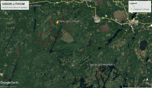 Figure 1 β Vision Lithium Property Portfolio β Location of Decelles and Cadillac Lithium Projects located South and West of Val-dβOr (CNW Group/Vision Lithium Inc.) The claims acquired from the vendors cover 2,315.5 hectares (23 km2) and, together with the claims staked by the Company, the Property comprises a total of 71 claims covering 4,109.7 hectares (41km2). Two additional claims staked by the Company have not yet been granted. The Property is located approximately 55 km south of Val-d'Or, Quebec and 75 km south-east of the Company's Cadillac Lithium property (Figure 1). The Property is easily accessible year-round by way of well-maintained roads. Property prospecting in 2021 suggests the presence of numerous pegmatitic dikes. No historical exploration for lithium is recorded.