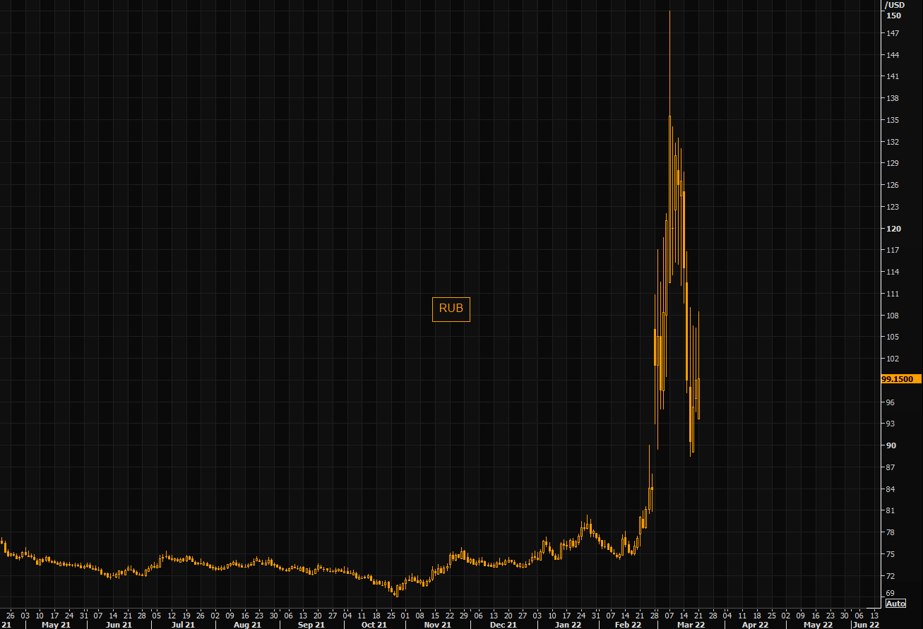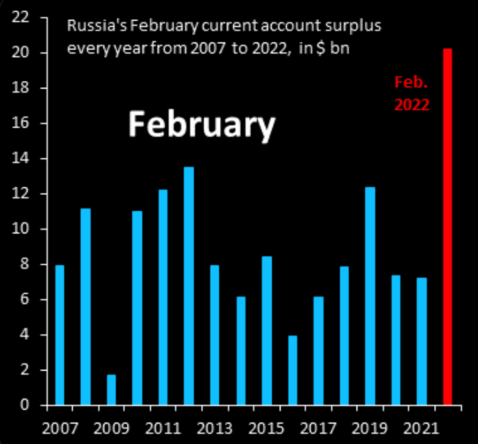 Source: Robin BrooksThe RUB remains "stubbornly" strong despite all the sanctions. Boss Brooks outlines: "Russia's financial conditions are easing and the bite of our sanctions is fading, because Russia's energy exports are constantly generating hard currency inflows, so - even though we blocked FX reserves - Russia is generating new ones." Did the world really think playing chess with Putin is easy?