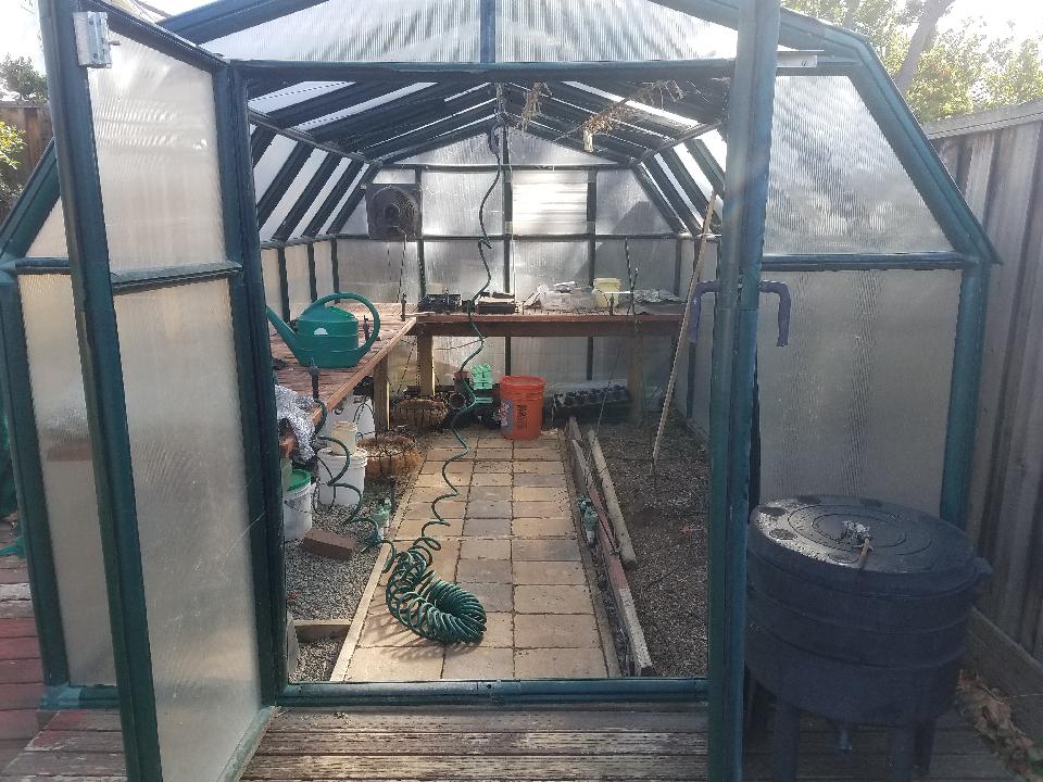 This is my 'Kit' Greenhouse built over 20 years ago. As I am away at another property in the Spring/Summer, I no longer really use the greenhouse other than to start seeds for friends. I built the benches, a French drain below the pavers and have (1) mist system, (2) exhaust Fan (powered by solar) and (3) plumbed for water including bench & drip emitters. One vent operates by Temp, the other can be opened by hand.
