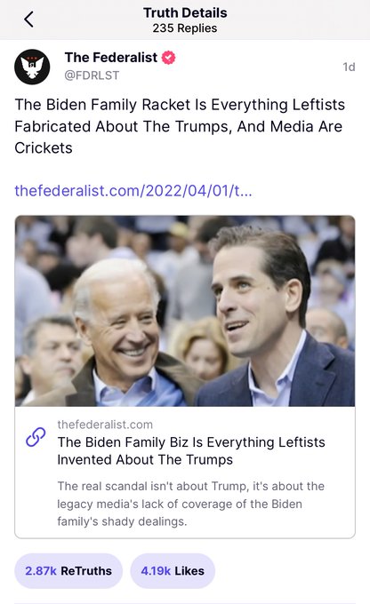 TWITTER SHADOW BANNING THE FEDERALIST. THEY GET MANY TIMES THE ENGAGEMENT WITH LESS THAN A TWENTIETH THE FOLLOWERS ON TRUTH SOCIAL...