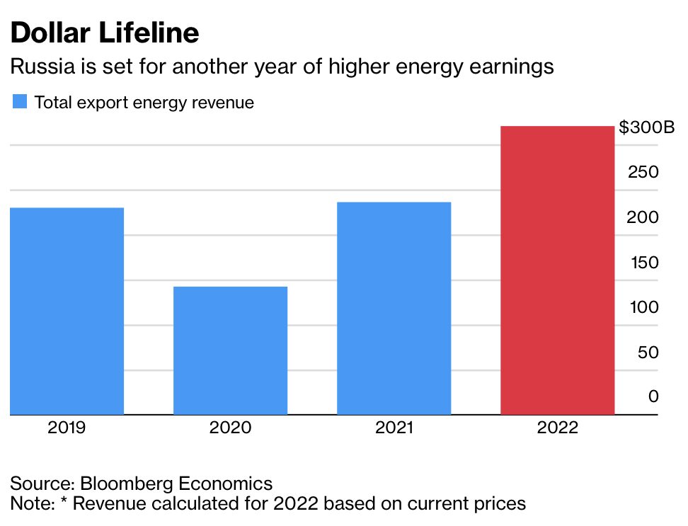 Even as Russia remains mostly cut off otherwise from the global economy, Bloomberg Economics expects the country will earn nearly $321 billionfrom energy exports this year, up more than a third from 2021.