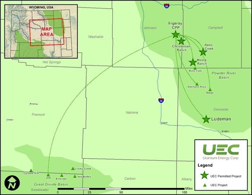 Ludeman: The Ludeman Project is fully permitted, is located in the South Powder River Basin ("SPRB") in Converse County, WY, and is comprised of the former Leuenberger, North Platte and Peterson projects developed in the late 1970's by various other operators. Two ISR pilot plant operations were previously carried out at the Leuenberger and North Platte properties. Most of the project area was held by Power Resources (Cameco) until 2003, after which Energy Metals (precursor to U1A) acquired the properties.