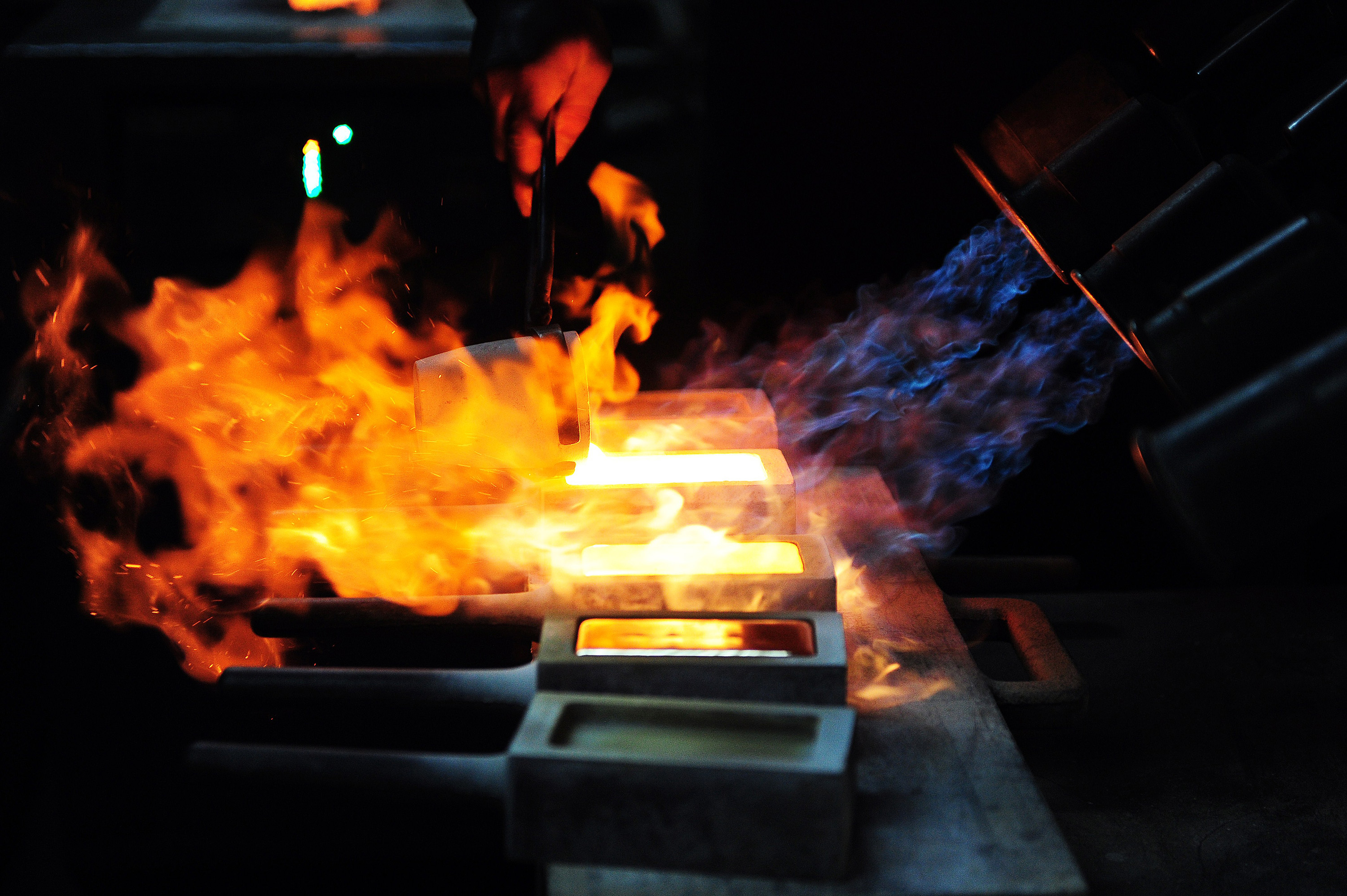 A worker pours molten gold into molds to make gold bullion at Istanbul Gold Refinery.
