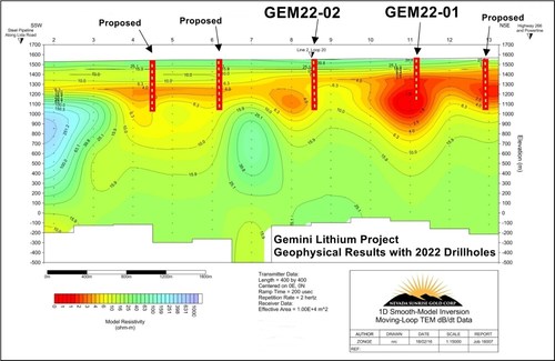 Additional drilling is planned following receipt of an amendment to the current Bureau of Land Management drilling permit, which will be required to cover the Company's newly-expanded land position. In April and May 2022, Nevada Sunrise staked 288 unpatented lode claims totaling 5,760 acres (1,756 hectares) over the outline of the gravity low to effectively cover the possible extent of the lithium-bearing clay layers. Follow-up geophysical EM surveys are underway at Gemini within the interpreted area of the historical gravity low to further map and assess the conductive layers first detected by Nevada Sunrise in 2016 (see Nevada Sunrise news release dated May 12, 2022).