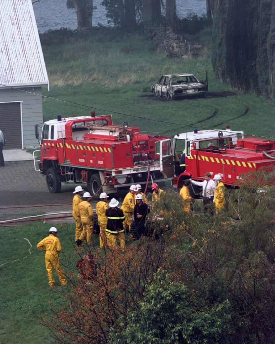Firefighters at the Seascape bed and breakfast, which Bryant set alight, ending the siege. He had killed its owners before he began his rampage at the Port Arthur heritage site. Photograph: Rick Rycroft/AP