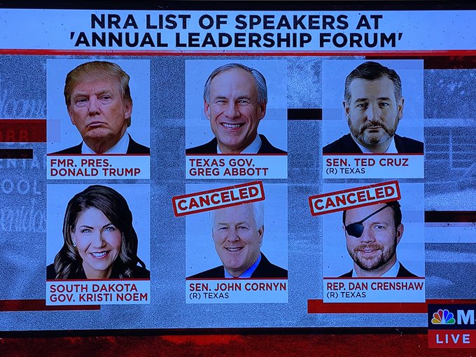 Senator John Cornyn and Rep Dan Crenshaw have cancelled their speeches at the NRA annual leadership forum this weekend. #Uvalde #NRA