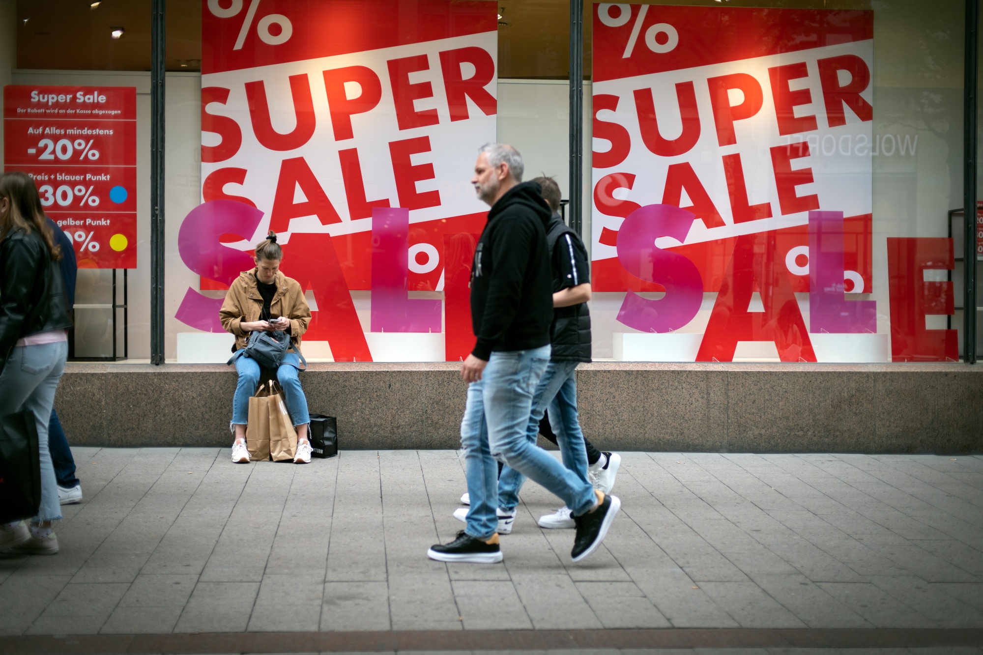 Stores offering sales discounts in Hamburg.Photographer: Imke Lass/BloombergNearly half of all Germans can no longer afford their lifestyle as inflation surges from one record to the next, according to a poll conducted for public broadcaster ARD.