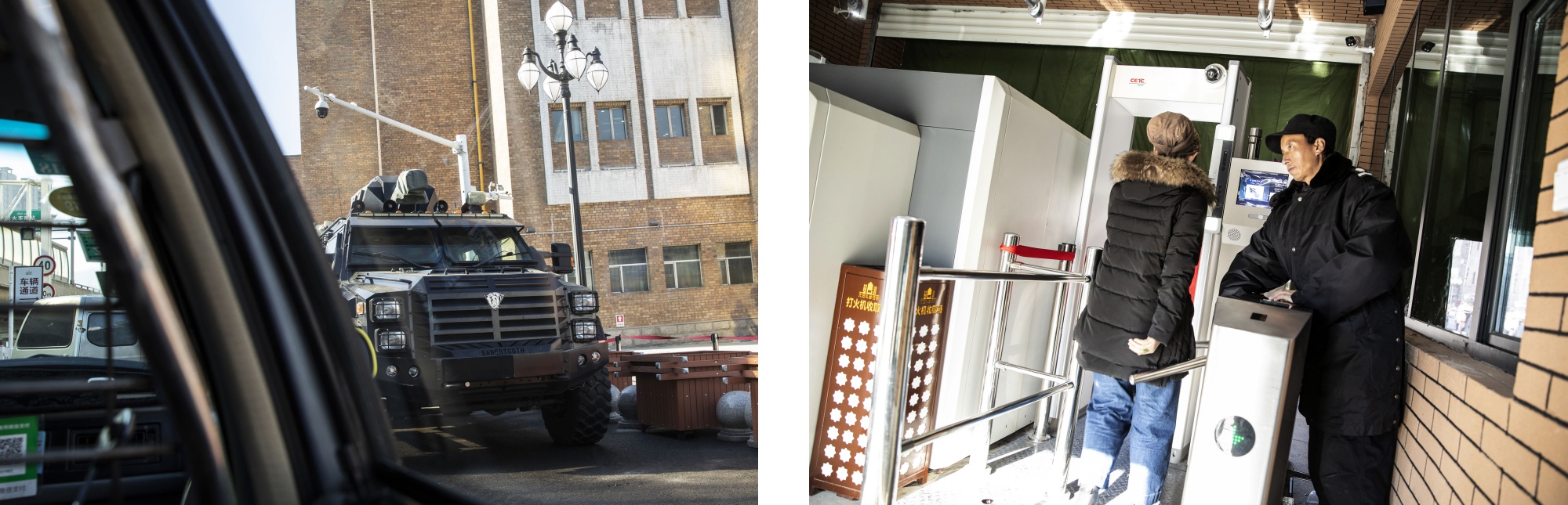 At one restaurant a waitress wore body armor, though it was unclear why: there is little visible crime in Khorgas. Police stations with flashing lights dotted the road and a near-constant whir of sirens filled the air.