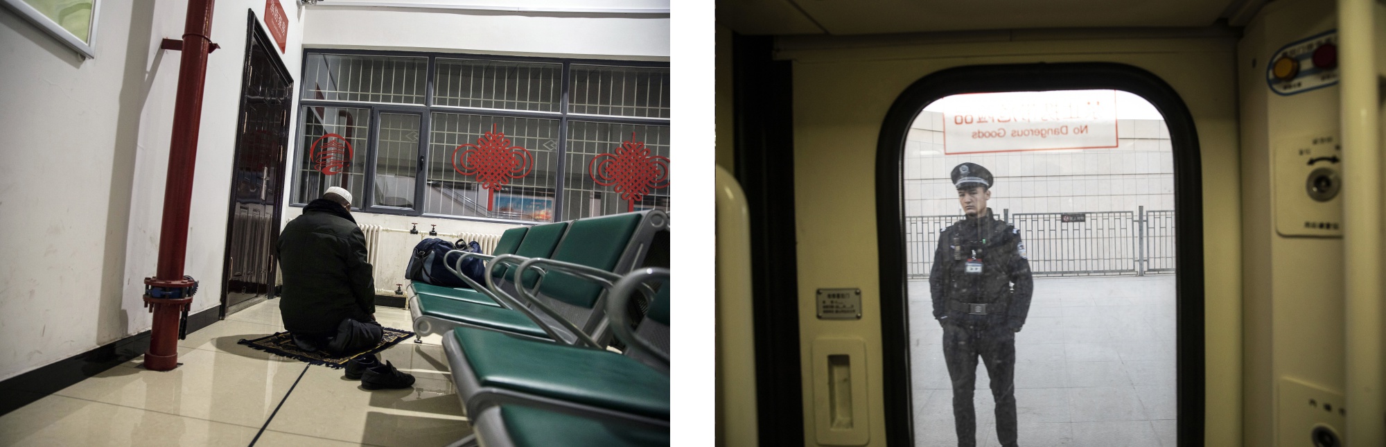Cameras watch over ancient forts; a Muslim man prays at a train station in Jiayuguan in Gansu province, just outside Xinjiang; Communist kitsch displayed at Yema Group's Urumqi headquarters; a tourist poses for a photo with a Uighur.