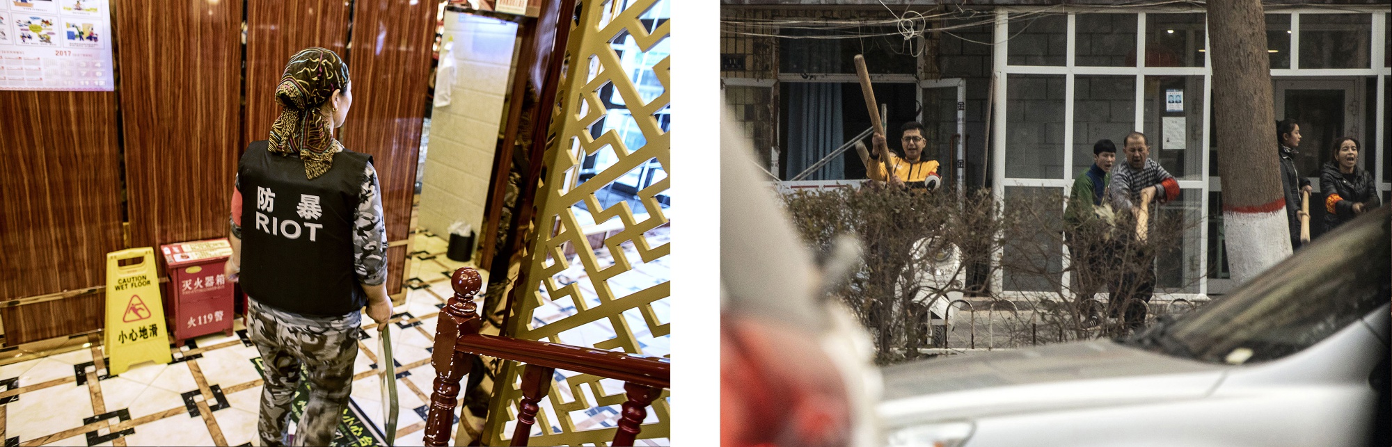 Wittingly or not, Han civilians play a part in the government’s efforts to stoke fears that a Uighur attack could happen at any moment. Groups of shopkeepers all around the city performed drills with wooden clubs. Knives were chained to the tables in butcher shops, and storefronts were barricaded at night.
