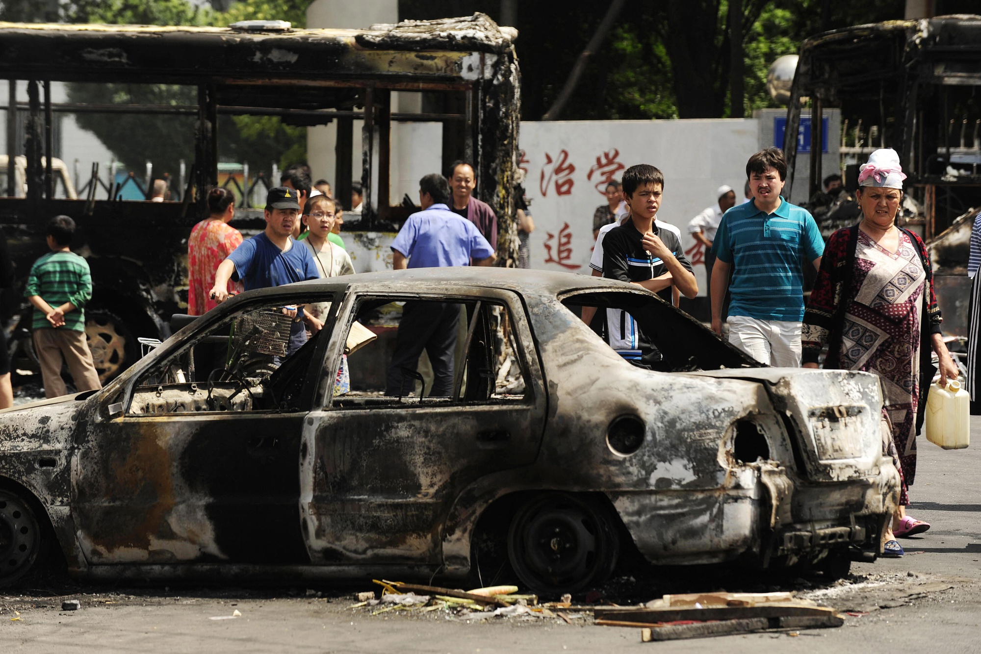 People inspect a burned vehicle after days of rioting by Uighurs in Urumqi in 2009. The uprising killed almost 200 people and raised concerns about how China treats its ethnic minorities.