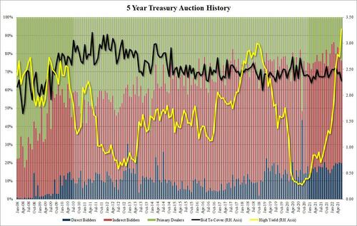 To: ggersh who wrote (67341 ) 6/27/2022 2:23:52 PM From: Broken_Clock Read Replies (1) | Respond to of 71455 Bad day at the Fed.... Welcome To QT: Terrible 5Y Auction Prices With Huge Tail As Foreign Demand Tumbles by Tyler Durden Monday, Jun 27, 2022 - 07:21 AM After an ugly, tailing 2Y auction 90 minutes earlier , moments ago the Treasury concluded the second auction for the day in this week's accelerated issuance schedule, when it sold $47 billion in 5Y paper at a high yield of 3.271%. This was notably not only because it was a whopping 53.5bps higher than the May high yield of 2.736%, but was the highest yield since 2007. More importantly, this was also the biggest tail for teh 5Y tenor since at least 2016 when our records begin. It only went downhill from there: the bid to cover was just as ugly, printing at 2.28, well below the 2.46% six-auction average, and the lowest since Feb 2021. And the internals were downright crap, with Indirects tumbling to 56.5% from an already low 62.9% last month; this was the lowest award to foreigners going back to Sept 21. And with Direct taking an in line 19.7% (vs 19.7% recent average), Dealers were left holding a whopping 23.8% of the auction, the first time they were awarded more than Directs since March and the highest Dealer award since Nov 2021. Overall, this was an unapologetically ugly 5Y auction, one which had the faint smell of that "failed" 7Y auction in Feb of last year, and speaking of failed 7Y auctions, we just may get one of those tomorrow. [url=] [/url] Which brings us to another point: if the collapse in buyside demand for US paper is a function of QT, which it very well might be, we expect that the QT-era will be very short lived and will be replaced with QE in the very near future, because as much as the Fed hates inflation, it hates a failed Treasury auction and a broken Treasury market much more...