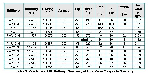 To: Goose94 who wrote (128907 ) 7/15/2022 12:42:45 PM From: Goose94 Read Replies (1) | Respond to of 202424 Altan Rio Minerals (AMO-V) Additional High Grade Mineralisation Reported From Pilot Deposit July 15, '22 - NR Results have been finalized from the phase 4 drill program completed in February, 2022, at Altan Rio Minerals Ltd.'s Pilot deposit in the Southern Cross region of Western Australia. As previously noted, the company has been impacted by significant delays in assay turnaround time, as assay laboratories in both Perth and Kalgoorlie have been inundated with samples from the unprecedented and continuing surge in exploration activity that has occurred in Western Australia. Commentary The Phase 4 drill program targeted depth extensions to the Pilot mineralisation, immediately below the historical underground workings (4 Level - 120 mbs) to a vertical depth extent of 170 metres below surface (mbs). The program comprised ten holes for 2,309 metres (PARC003, 042, 044 to 046, 048 to 052) which were designed to evaluate high grade gold mineralisation previously reported from drillholes PARC005 and PARC010 (refer to TSXV: AMO March 10, 2021). Previous reported intercepts: PARC005 13 metres grading 4.48 g/t Au from 160m, and 4 metres grading 7.51 g/t Au from 176m, including 1m @ 19.14 g/t, and 8 metres grading 9.65 g/t Au from 199m, including 5m @ 13.93 g/t PARC010 10 metres grading 4.21 g/t Au from 182m, including 7m @ 5.69 g/t. Onsite logging of the drill chips from the Phase 4 RC drill program, completed on the 24th February 2022, confirmed drilling had intersected the interpreted position of the mineralisation. One metre samples from these mineralised intervals were selected for immediate sampling and assaying with the remainder of each drillhole, composite sampled over a four metre interval. Results have now been received for all sampling completed, confirming the presence of high grade gold mineralisation with previously reported intercepts (refer to TSXV: AMO March 17, 2022) of: PARC003 13 metres grading 7.30 g/t from 158m, including 2m @ 28.51 g/t, and PARC048 12 metres grading 6.72 g/t from 132m, including 3m @ 17.83 g/t, and PARC049 6 metres grading 4.64 g/t from 181m, and 17 metres grading 3.25 g/t from 193m (ation) Supported with new intercepts of: PARC044 15m @ 2.17 g/t Au, including 4m @ 6.22 g/t Au from 175m, and PARC046 2m @ 4.09 g/t Au from 181m, and 16m @ 3.11 g/t Au, including 4m @ 6.21 g/t Au from 194m. Pursuant to its exploration and mining agreement (the "Pilot Agreement" or "PEMA") with Barto Gold Mining Pty Ltd ("Barto"). Overall, drilling conditions were excellent with dry samples and good recoveries. However, drillhole PARC049 intersected a void/cavity at 155 metres with significant amounts of water, drilling continued until a depth of 210 metres when the hole was stopped and abandoned. Samples from 155 metres onwards in this hole were damp to wet with variable recoveries. Caution should be applied to the significance of assays reported from this drillhole. The Phase 4 drill program also comprised two pre-collars (PARD041 and 042) totalling 460m completed in preparation for a diamond drill program to evaluate the PEM4 conductor immediately below the high grade mineralisation reported previously and in this announcement. A suitable diamond drill rig is currently being sourced to conduct this program. A complete summary of Phase 4 drill program one metre results are provided in Table 1 below, with location of drill intercepts shown in Figure 1 and Figure 2. Post completion of the Phase 4 drill program, interrogation of the 3D model and drill results received was completed. As a result of hole deviation during drilling, two holes (PARC046 and PARC049) are now believed to have tested the upper/shallowest margin of the PEM4 conductor. The PEM4 conductor has been modelled as a single plate with dimensions of an estimated 130 metres in strike with a depth extent of 200 metres, approximately 170 to 370 metres below surface (refer to TSXV: AMO March 16, 2021). Drill intercepts of 16m @ 3.11 g/t Au from 194m in PARC046 and 17m @ 3.25 g/t Au from193m in PARC049 are both interpreted to be immediately above the modelled plate position (refer Figure 3). The position of these intercepts are thought to represent the PEM4 conductor. These findings have significantly increased the confidence of the PEM4 conductor representing sulphide rich high grade gold mineralisation. In addition, interrogation of the model suggests drillhole PARC049 was terminated while still in a mineralised zone and prior to intersecting the position of the main lode. Modelling suggests the high grade component of Pilot mineralisation remains to be tested below this hole. The company is now investigating completing this hole with a diamond tail to evaluate the high grade mineralisation. Pilot Hanging Wall Mineralisation In addition to the one metre results reported in Table 1, the Phase 4 drill program also recorded broad, near surface gold anomalism from four metre composite sampling. Near surface gold anomalism has been recorded in all drillholes from the Phase 4 drill program and are interpreted to represent a new zone of mineralisation ("Hanging Wall" mineralisation), located approximately 100 metres grid west and parallel to the Pilot Main Lode mineralisation. These anomalous results are summarised in Table 2 with the trend of the "Hanging Wall" mineralisation shown on plan in Figure 1. Down-dip continuity of this "Hanging Wall" mineralisation has been confirmed with an intercept from drillhole PARD040, a pre-collar for the diamond drill program, which returned an intercept from 1 metre sampling (refer Table 1) of: 3m @ 2.22g/t Au from 176m within a broader mineralised zone of 11m @ 0.76g/t Au from 168m. The near surface position of the "Hanging Wall" mineralisation and its down-dip projection is represented in Figure 4 below. Identification of this new mineralised trend in proximity to the mineralisa