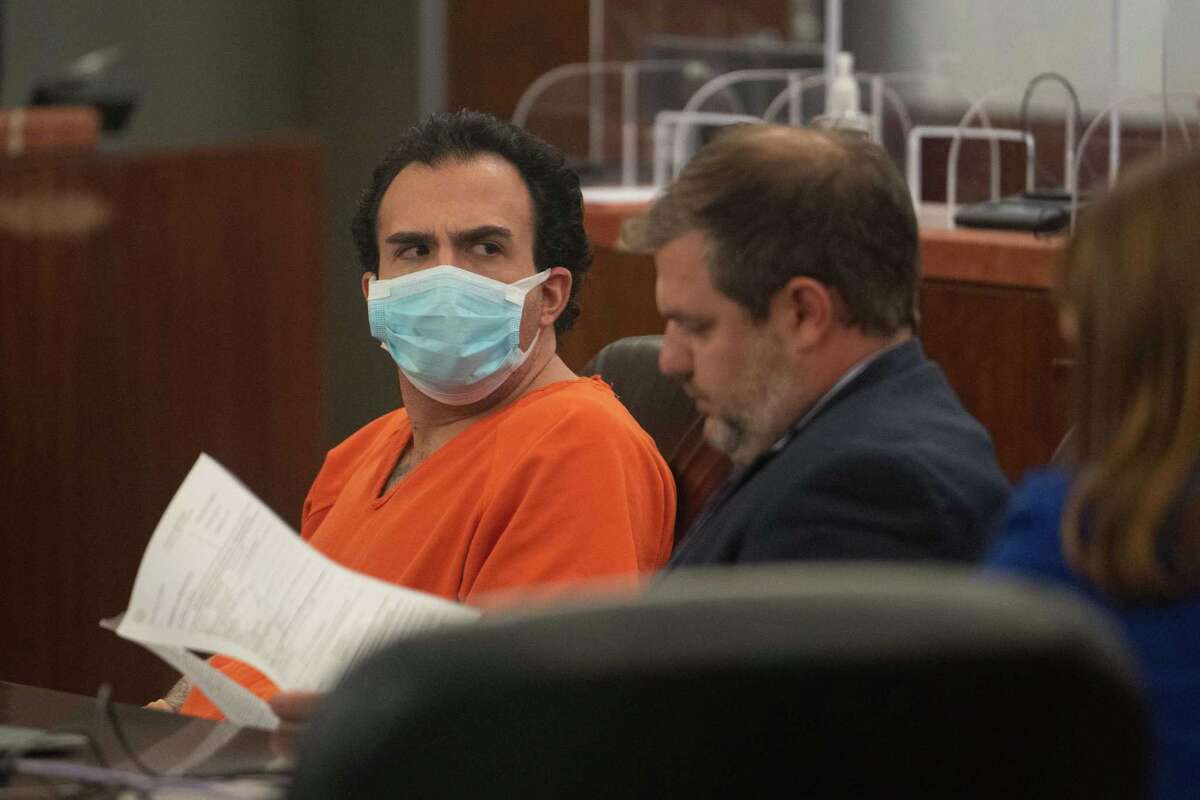 Harris County Prosecutor Jacob Salinas, left, makes arguments in a sentencing hearing for Guido Herrera in Judge Franklin Bynum’s County Criminal Court District 8, Thursday, July 14, 2022, at the Harris County Criminal Courthouse in Houston. Herrera was charged with disorderly conduct after he showed up at the Galleria in February with a loaded assault-styled weapon. He had extra ammo in his coat. Police tackled him before he could aim the weapon at anyone. Herrera later, while out on bond, tried to enter an FBI office in Houston with a gun in his possession.