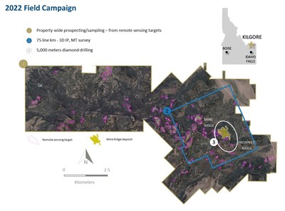 2022 Exploration Program Extensive core re-logging and resampling and 3D modelling of historical results were completed in preparation for the 2022 Kilgore exploration program. The reinterpreted data identified multiple high-priority near-deposit drill targets (see Company's press release dated March 10, 2022). The objectives of ongoing drilling are to: (i) grow and increase the grade of the existing mineral resource, (ii) using oriented core, define vertical to sub-vertical high-grade structures within the existing mineral resource and to depth in the underlying Aspen formation and (iii) target geophysical anomalies defined from imminent IP and MT surveys.