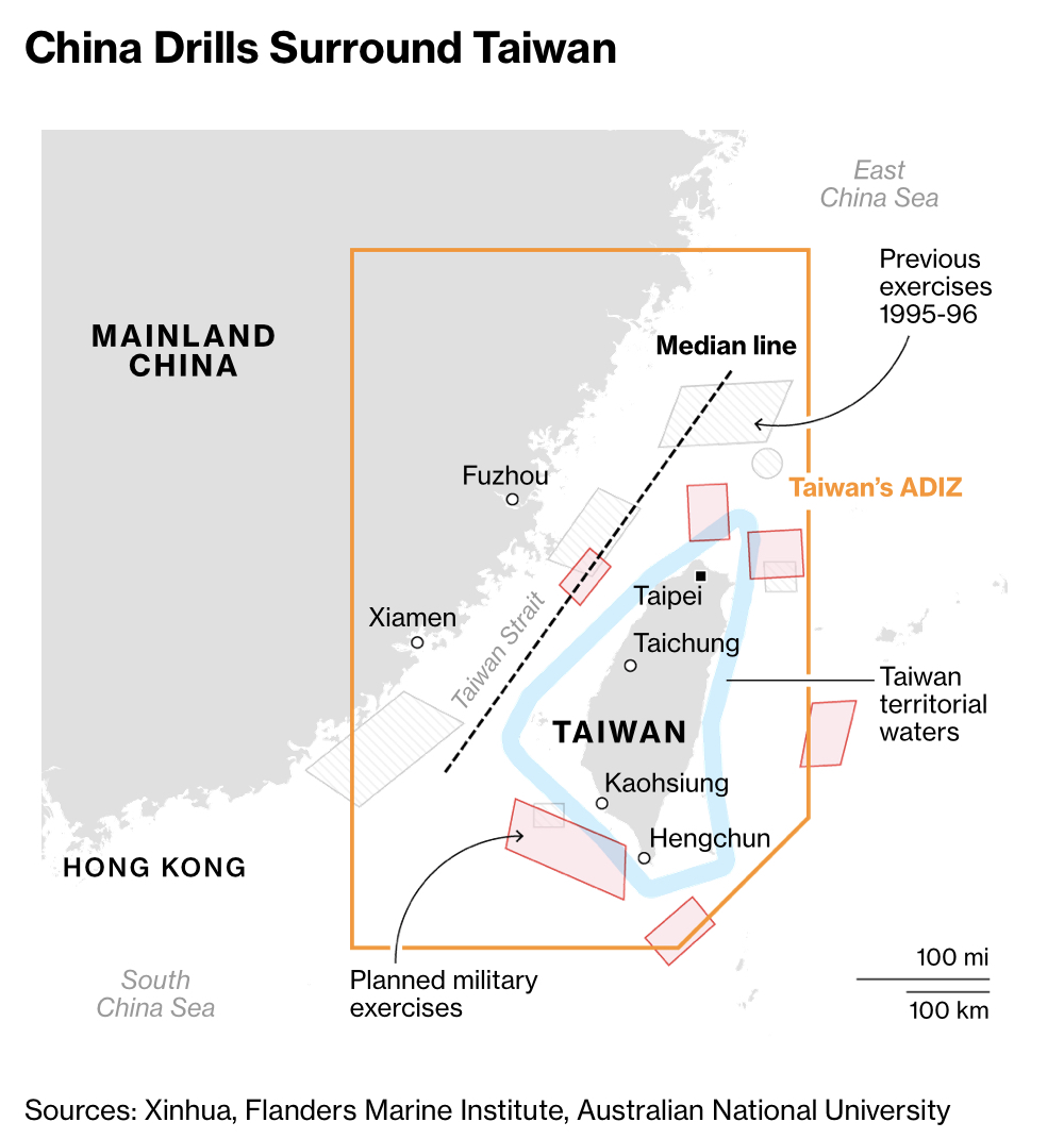 The exercises threaten to disrupt shipping and airline routes in Taiwan, one of the world’s most-crucial suppliers of computer chips. Several airlines are planning adjustments to their flights, while pilots of Hong Kong’s Cathay Pacific Airways Ltd. were advised to carry 30 minutes worth of extra fuel for possible rerouting in Taiwan.