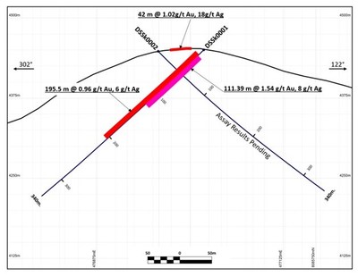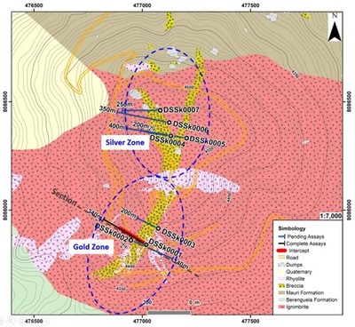 Hole DSSk0001 was drilled to test the continuous surface chip sampling results of 42m interval grading 1.02 g/t Au and 18 g/t Ag (please refer to the Company's news release on June 14, 2022). Figures 1 & 2 show the drill hole location and geological cross section. Gold mineralization discovered is hosted in volcanic clastic sediments (breccia or ignimbrites) that extend to North and North-East with fractures dipping at high angles to the east. The ignimbrite or breccia host rock for gold is similar to the Company's gold discovery at the Carangas Project, in the Department of Oruro, Bolivia.