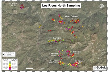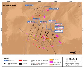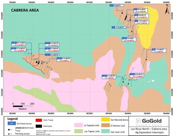 HALIFAX, NS, Sept. 14, 2022 /CNW/ - GoGold Resources Inc. (TSX: GGD) (OTCQX: GLGDF) ("GoGold", "the Company") is pleased to release the results of 6 drill holes from the El Nayar area and 15 drill holes from the Gran Cabrera area within Los Ricos North property. The El Nayar and Gran Cabrera areas are targets of the Los Ricos North regional exploration drilling program. Hole LRGNY-21-027 at El Nayar intersected 2,192 g/t silver equivalent ("AgEq") over 1.3m, contained within 18.2m of 241 g/t AgEq. At Gran Cabrera, hole LRGCB-22-020 intersected 905 g/t AgEq over 1.6m, contained within 17.3m of 132 g/t AgEq. See Table 1 for a breakdown of gold and silver values at El Nayar and Table 2 for Gran Cabrera.