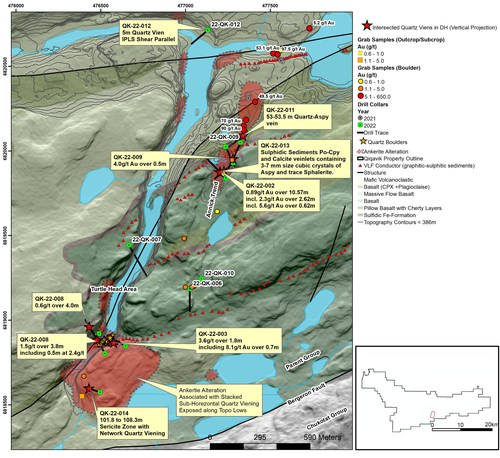 Newly discovered gold mineralization is associated with a quartz and iron carbonate vein system that may extend over a 2 km strike length from North to South. 2,720 metres of diamond drilling in 14 Holes was completed. Only 19% of the assays from this drilling have been received to date.Preliminary assay results have reported up to 8.1 g/t gold over 0.7 metres in QK-22-003 in quartz veining with sphalerite and visible gold (Table 1 and Figure 1).Extensive mapping focused on the area around the Annick trend and Turtle Head area has identified new metre-scale, gold-bearing quartz carbonate veins in subcrop.392 frost boil (till) samples were collected as part of the regional Qiqavik exploration program. Results for these sample have yet to be received.29 line-kilometres of induced polarization (IP) ground geophysics were completed along the Annick Trend.121 line-kilometres of ground magnetic surveying (Walking Mag) were completed along the Annick & Eric Trends. David Christie, President and CEO of Orford, commented "Orford's technical team was successful in discovering a mineralized altered vein system that we believe is related to the system hosting the Annick style high-grade gold boulders. With two of our drill holes intersecting visible gold and 12 of 14 drill holes intersecting mineralized quartz and iron carbonate veins, I believe the summer's efforts have been successful. Our understanding of the structural and mineralization environment of the region has evolved to a much better level than it was at the start of the summer. Once we receive all the analytical results, we will complete our geological interpretation and plan the best method to follow up the 2022 results".
