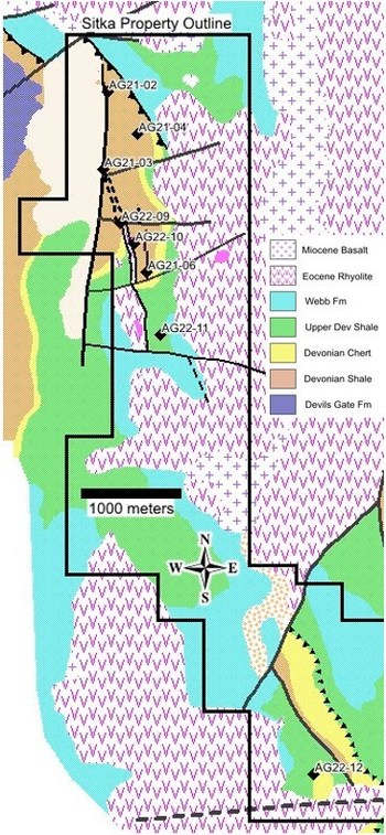 On the SSE projection of the structural trend, AG22-11 was collared 940 m SSE of AG22-10 (Figure 1). The hole was directed WSW toward the inferred projection of the structural zone and encountered a rhyolite dike-filled fault zone followed by decalcification and pyrite mineralization in the Horse Canyon equivalent host horizon. The hole was completed to the top of the Devils Gate Limestone at 522.73 m. AG22-12 was collared at Frazier Creek 5,600 meters SSE of AG22-10. The hole encountered a major dike-filled structure along with pyrite mineralization in the upper Devonian Shale unit and is still in progress in the lower part of the Devonian Shale. No assay results have been received for these two holes.
