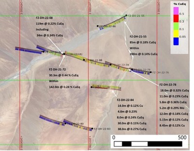 The Pyros target is represented by a 2,500 x 1,400 m zone of sericitic alteration overprinting early quartz veins, where soil geochemistry identified a core Mo-Cu-Au-Bi-Te soil anomaly surrounded by a Mn-Zn-Pb halo. The first round of drilling completed last May only tested around 20% of the anomalous alteration zone. Drilling results identified different porphyry phases with potassic and sericitic alteration intruding Permian granites. The first campaign of drilling proved the Cu-Mo-Au affinity of the porphyry system at Pyros reporting 119 m @ 0.22 % CuEq, including 34.0m @ 0.34% CuEq (FZ-DH-22-68), 30.3m @ 0,44% CuEq (FZ-DH-22-72), 38.0m @ 0.27% CuEq (FZ-DH-22-84), and 200m @ 0.14% CuEq (FZ-DH-21-55). One hole was drilled on the margin of the Antenna Hill target, represented by Au-Cu-Ag anomalies associated to breccias and ~20 Ma dioritic intrusions hosted by Paleozoic basement along faults related to the eastern limit of the Miocene volcanic caldera. The recognizing hole completed at Antenna Hill reported various Au-Cu-Ag anomalous intercepts including 8.75 m @ 1.20 g/t AuEq. Detailed highlighted values are presented in Table 1.