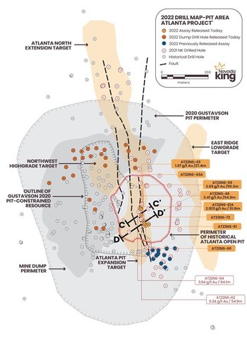 VANCOUVER, BC, Oct. 18, 2022 /CNW/ - Nevada King Gold Corp. (TSXV: NKG) (OTCQX: NKGFF) ("Nevada King" or the "Company") is pleased to announce assay results from 32 reverse circulation ("RC") holes recently completed at its Atlanta Gold Mine Project located 264km northeast of Las Vegas, Nevada, in the prolific Battle Mountain Trend. This drilling includes eight holes designed to further define the high-grade Atlanta Mine Fault Zone ("AMFZ") at the bottom of the historical Atlanta pit, together with 24 shallow holes drilled to test waste dumps from previous mining north and west of the historical pit.