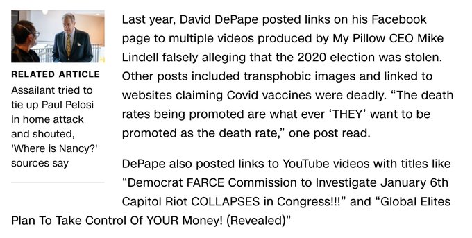 The suspect in the attack of Paul Pelosi has been confirmed to be a 42-year-old right-wing extremist who spread 2020 election conspiracy theories, COVID disinformation, and hatred of the Jan 6 committee.
