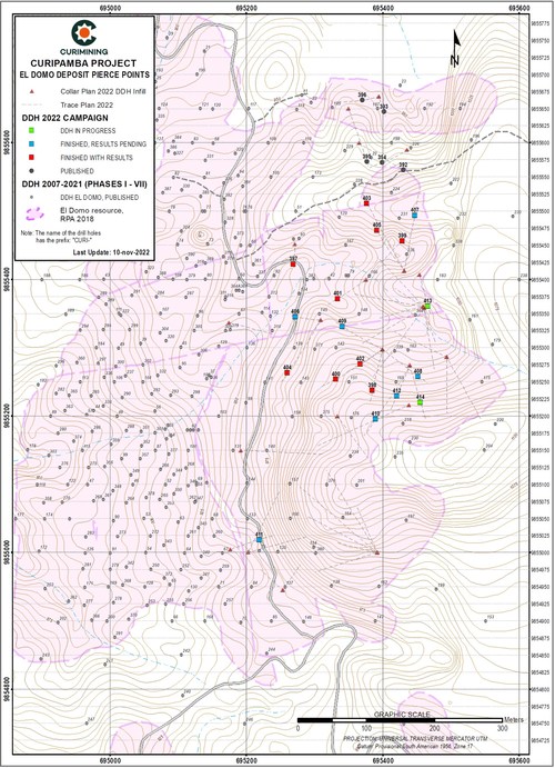 TORONTO, Nov. 15, 2022 /CNW/ - Adventus Mining Corporation ("Adventus Mining") (TSXV: ADZN) (OTCQX: ADVZF) and Salazar Resources Limited ("Salazar") (TSXV: SRL) (OTCQB: SRLZF) (collectively the "Participants") are pleased to announce the additional infill drilling results from the underground portion of the El Domo volcanogenic massive sulphide deposit ("El Domo") located within the 21,537-hectare Curipamba project in central Ecuador. The infill drilling program for the underground portion of the Mineral Resource at El Domo, as announced in the August 29, 2022 press release, continues with two diamond drill rigs.