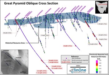 "The diamond core extension of drill hole 22GPRC003 has delivered outstanding results from considerable depth below the area of the historical resource at Great Pyramid," commented Chris Donaldson, Executive Chairman. "This drill hole demonstrates the continuation of the system to depth with excellent grade. The holes reported here, in conjunction with historical drill holes and TinOne's other deeper holes, are allowing us to understand the full extent and geological controls at Great Pyramid."